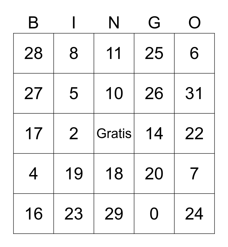 numeros 0-31 Bingo Card