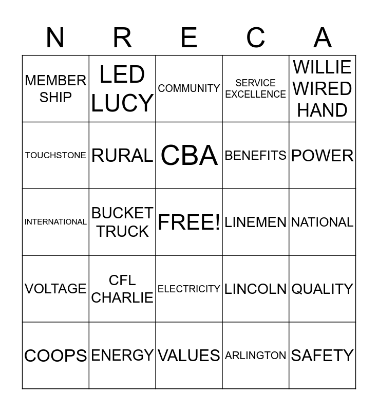 This bingo card has a free space and 24 words: CFL CHARLIE, ENERGY, CBA, COOPS, WILLIE WIRED HAND, MEMBER SHIP, TOUCHSTONE, LED LUCY, LINEMEN, ELECTRICITY, BENEFITS, INTERNATIONAL, LINCOLN, QUALITY, RURAL, ARLINGTON, NATIONAL, COMMUNITY, POWER, BUCKET TRUCK, SAFETY, VOLTAGE, SERVICE EXCELLENCE and VALUES.
