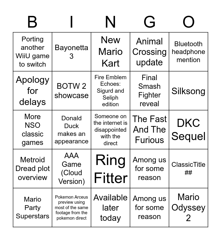 This bingo card has a free space and 25 words: AAA Game (Cloud Version), Available later today, Fire Emblem Echoes: Sigurd and Seliph edition, Mario Party Superstars, Bluetooth headphone mention, Porting another WiiU game to switch, Apology for delays, Bayonetta 3, The Fast And The Furious, Ring Fitter, Final Smash Fighter reveal, More NSO classic games, Among us for some reason, ClassicTitle ##, BOTW 2 showcase, Mother 3 confirmed to never be localized, DKC Sequel, New Mario Kart, Silksong, Donald Duck makes an appearance, Mario Odyssey 2, Pokemon Arceus preview using most of the same footage from the pokemon direct, Metroid Dread plot overview, Animal Crossing update and Among us for some reason.