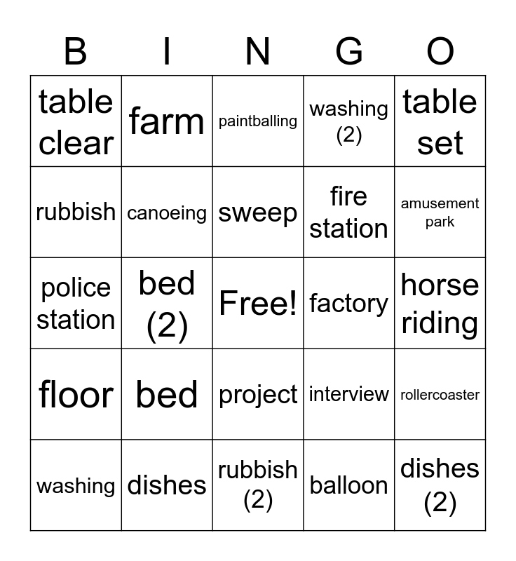 This bingo card has a free space and 24 words: bed, dishes, sweep, washing, table set, table clear, rubbish, farm, factory, project, fire station, police station, interview, rollercoaster, canoeing, balloon, horse riding, paintballing, amusement park, bed (2), dishes (2), floor, washing (2) and rubbish (2).