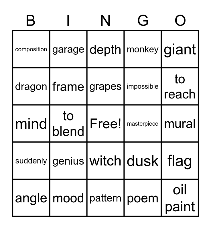 This bingo card has a free space and 29 words: angle, to be on display, to blend, brightness, composition, depth, frame, genius, masterpiece, mood, mural, oil paint, pattern, poem, to reach, wizard, witch, suddenly, giant, mind, dusk, eyewitness, impossible, dragon, monkey, garage, flag, grapes and jewellery.