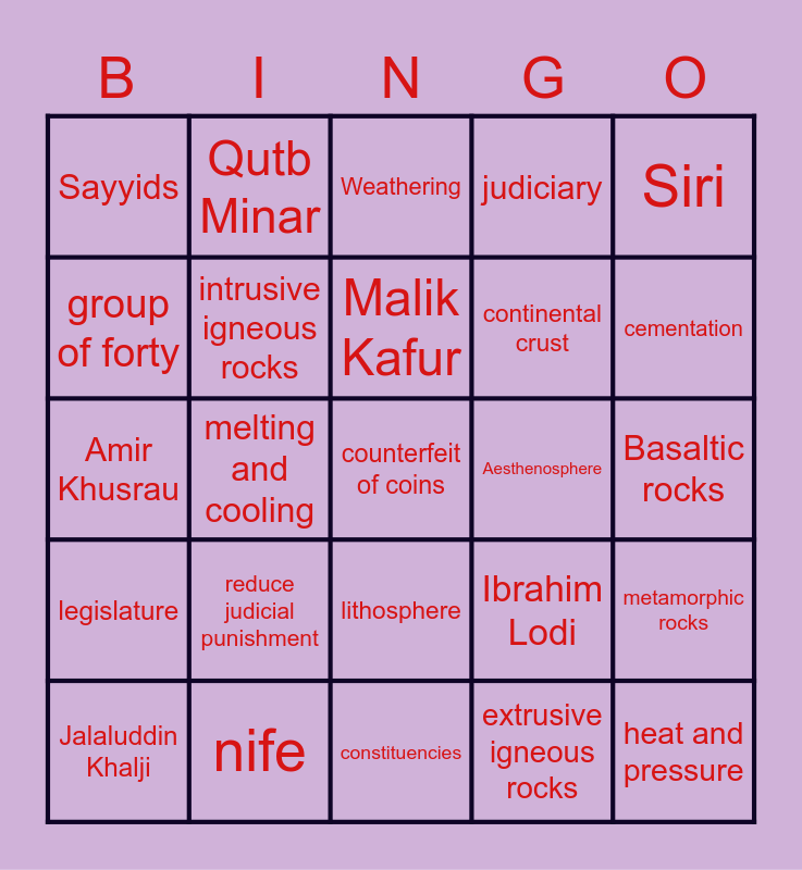 This bingo card has a free space and 24 words: reduce judicial punishment, nife, Malik Kafur, Jalaluddin Khalji, Siri, Sayyids, group of forty, Qutb Minar, Aesthenosphere, lithosphere, continental crust, Amir Khusrau, Ibrahim Lodi, metamorphic rocks, intrusive igneous rocks, extrusive igneous rocks, Basaltic rocks, Weathering, cementation, melting and cooling, heat and pressure, legislature, judiciary and constituencies.