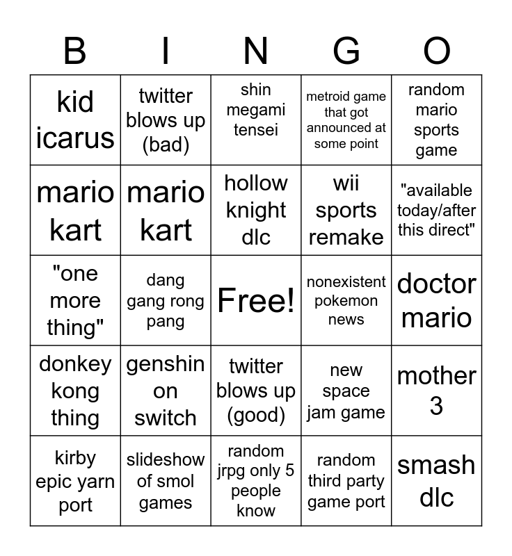 This bingo card has a free space and 44 words: botw delay, smash dlc, random mobile game from nowhere, kirby epic yarn port, arceus legends you're welcome kevin, random third party game port, shin megami tensei, doug bowser cameo, random mario sports game, slideshow of smol games, metroid game that got announced at some point, nonexistent pokemon news, twitter blows up (good), genshin on switch, splatoon 3 news ?, random jrpg only 5 people know, waluigi in smash, "one more thing", botw no news, "available today/after this direct", twitter blows up (bad), overpriced remaster, monster hunter dlc, kid icarus, animal crossing update, doctor mario, f zero, punch out, new space jam game, donkey kong thing, project triangle, mother 3, cooking mama returns !?, random visual novel, dang gang rong pang, more joy con colors and/or lim ed switch, mebe fire emb, omori switch, hollow knight dlc, mario kart, wii sports remake, smash in fortnite, mario kart and suing guys that make dolphin.
