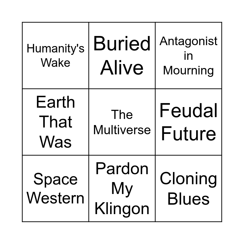 This bingo card has 60 words: Cyberpunk, Synthetic Plague, Alien Invasion, Stable Time Loop, Steampunk, AI is a Crapshoot, Space Western, Terraform, Cloning Blues, Cyborg, Earth That Was, Faster-Than-Light Travel, Feudal Future, First Contact, Freak Lab Accident, Humanity's Wake, Uplifted Animal, The Multiverse, Space Pirates, Pardon My Klingon, Alone in a Crowd, Antagonist in Mourning, Appearance Angst, Eye Scream, Big "Why?!", Broken Hero, Heal It With Booze, Despair Event Horizon, Self-Surgery, My God, What Have I Done?, Rage Against the Reflection, Survivor's Guilt, Hanahaki Disease, Sadistic Choice, Buried Alive, Danger - Thin Ice, Mortal Wound Reveal, Rasputinian Death, Mind Control, Choke Holds, Babies Ever After, Cheery Pink, Comfort Food, Everybody Lives, Happily Adopted, Home Sweet Home, Happy Dance, Pet the Dog, Pursue the Dream Job, Happily Married, So Proud of You, Tears of Joy, You Are Not Alone, Family of Choice, Bear Hug, Friendship Trinket, Platonic Declaration of Love, Vitriolic Best Buds, The Power of Family and Hot Drink Cure.