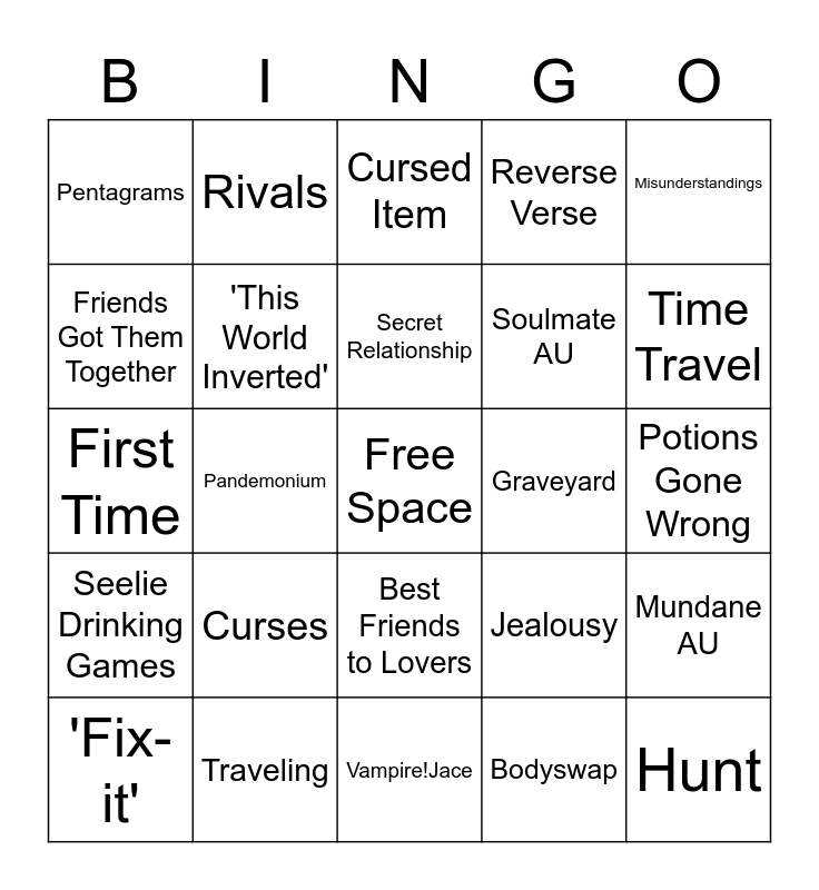 This bingo card has a free space and 24 words: Curses, Traveling, Secret Relationship, 'Fix-it', Misunderstandings, Pentagrams, Friends Got Them Together, Rivals, Graveyard, Best Friends to Lovers, Soulmate AU, First Time, Jealousy, Mundane AU, 'This World Inverted', Bodyswap, Potions Gone Wrong, Cursed Item, Time Travel, Pandemonium, Hunt, Seelie Drinking Games, Reverse Verse and Vampire!Jace.