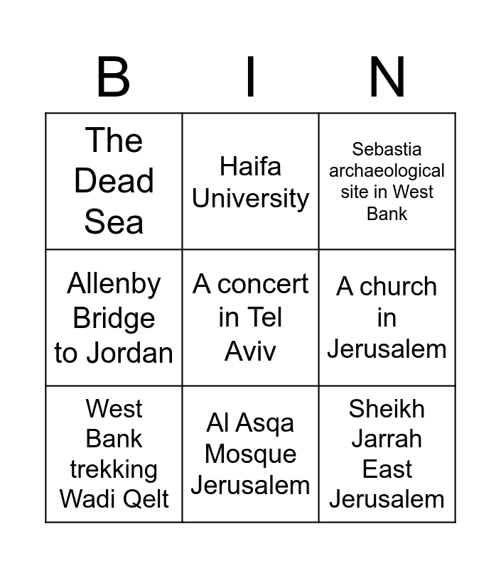 This bingo card has a free space and 17 words: Ben Gurion Airport, to enjoy the sea, Sebastia archaeological site in West Bank, The Dead Sea, The Wailing Wall, Allenby Bridge to Jordan, Jerusalem Hospital, West Bank trekking Wadi Qelt, Al Asqa Mosque Jerusalem, A church in Jerusalem, Bethlehem, Rafah Crossing from Gaza to Egypt, Sheikh Jarrah East Jerusalem, Haifa University, Birzeit University West Bank, Joseph's tomb Nablus and Tomb of Patriarchs Hebron.