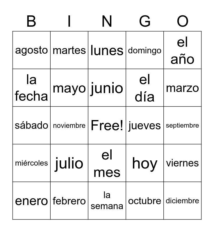 This bingo card has a free space and 27 words: hoy, mañana, el día, la semana, la fecha, lunes, martes, miércoles, jueves, viernes, sábado, domingo, enero, febrero, marzo, abril, mayo, junio, julio, agosto, septiembre, octubre, noviembre, diciembre, el mes, el año and no cap / No mayuscula.