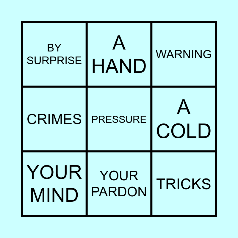 This bingo card has 9 words: YOUR MIND, PRESSURE, WARNING, BY SURPRISE, A HAND, A COLD, CRIMES, YOUR PARDON and TRICKS.