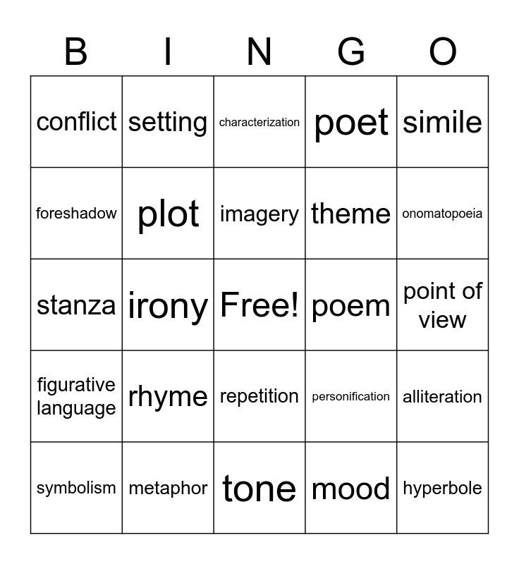 This bingo card has a free space and 24 words: rhyme, metaphor, imagery, symbolism, simile, conflict, foreshadow, setting, poem, repetition, theme, stanza, personification, alliteration, plot, mood, point of view, characterization, onomatopoeia, irony, hyperbole, figurative language, poet and tone.