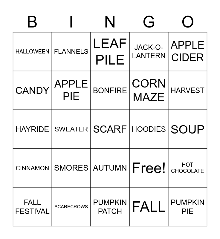 This bingo card has 25 words: SMORES, PUMPKIN PATCH, BONFIRE, FALL FESTIVAL, APPLE CIDER, HALLOWEEN, CANDY, FLANNELS, HOODIES, AUTUMN, CORN MAZE, HAYRIDE, Free!, HOT CHOCOLATE, APPLE PIE, PUMPKIN PIE, SOUP, LEAF PILE, HARVEST, SWEATER, SCARF, SCARECROWS, CINNAMON, JACK-O-LANTERN and FALL.