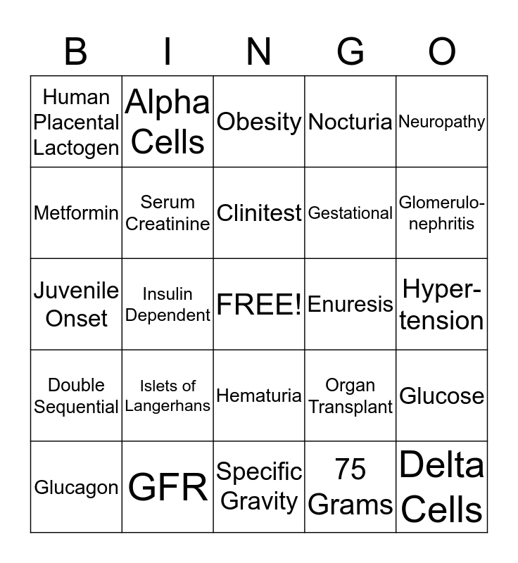 This bingo card has a free space and 24 words: Islets of Langerhans, GFR, Clinitest, Glucagon, Neuropathy, Human Placental Lactogen, Metformin, Alpha Cells, Enuresis, Hematuria, Gestational, Juvenile Onset, Organ Transplant, Glucose, Serum Creatinine, 75 Grams, Hyper-tension, Obesity, Glomerulo-nephritis, Insulin Dependent, Delta Cells, Double Sequential, Nocturia and Specific Gravity.