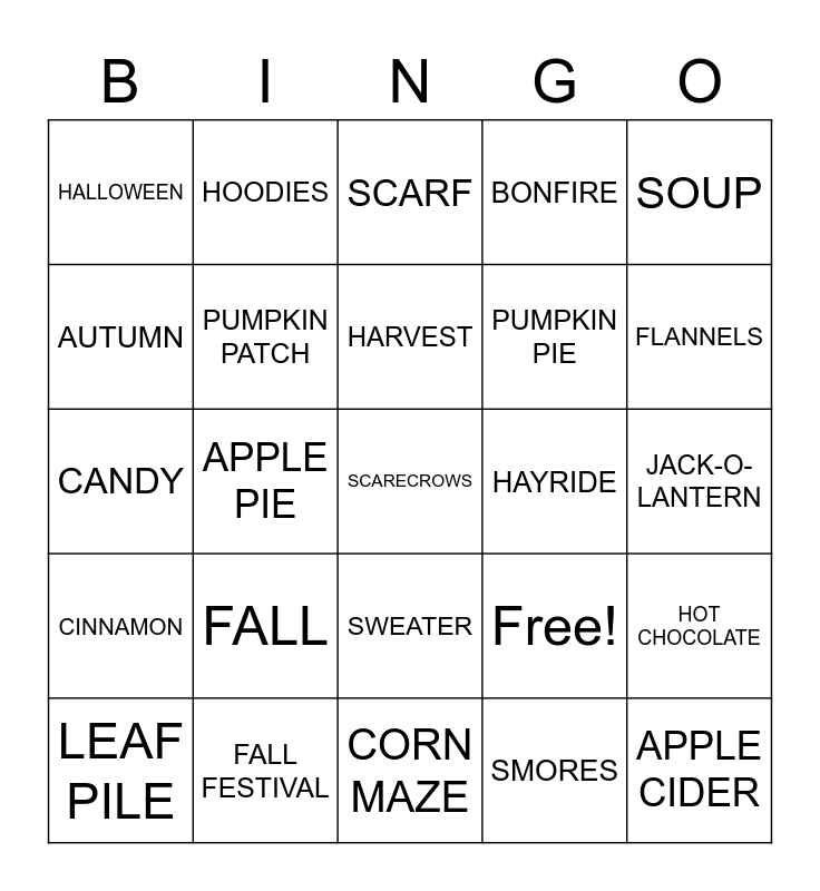 This bingo card has 25 words: FALL, CORN MAZE, HARVEST, LEAF PILE, SOUP, HALLOWEEN, AUTUMN, HOODIES, HAYRIDE, SWEATER, PUMPKIN PIE, CANDY, Free!, HOT CHOCOLATE, PUMPKIN PATCH, APPLE CIDER, JACK-O-LANTERN, SCARF, FLANNELS, APPLE PIE, SCARECROWS, FALL FESTIVAL, CINNAMON, BONFIRE and SMORES.