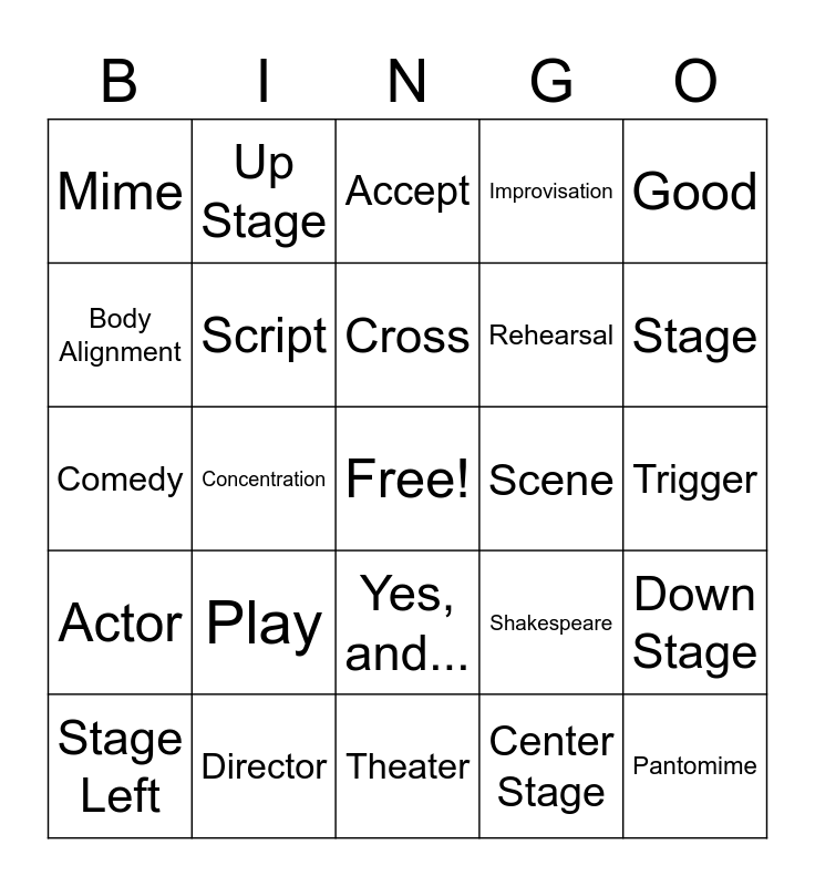 This bingo card has a free space and 28 words: Down Stage, Stock Character, Rehearsal, Center Stage, Body Alignment, Accept, Up Stage, Actor, Scene, Stage Left, Comedy, Improvisation, Director, Theater, Stage, Tragedy, Play, Script, Cross, Yes, and..., Mime, Stage Right, Pantomime, Concentration, Trigger, Shakespeare, Good and Show Offs.