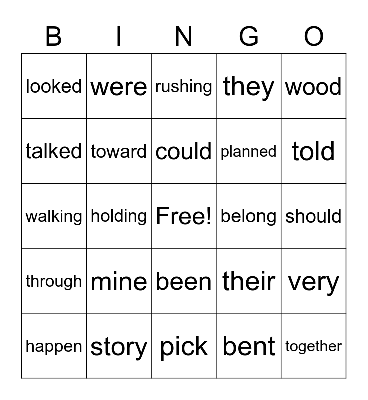 This bingo card has a free space and 29 words: happen, remember, holding, belong, looked, rushing, toward, mine, belong, story, should, together, pick, bent, told, friends, been, through, wood, walking, their, road, planned, talked, they, were, very, could and lake.