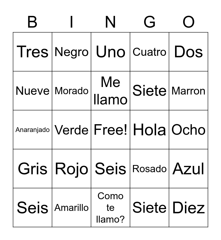 This bingo card has a free space and 24 words: Rojo, Amarillo, Me llamo, Seis, Dos, Tres, Nueve, Negro, Hola, Seis, Siete, Anaranjado, Rosado, Azul, Morado, Siete, Ocho, Uno, Marron, Verde, Diez, Gris, Cuatro and Como te llamo?.
