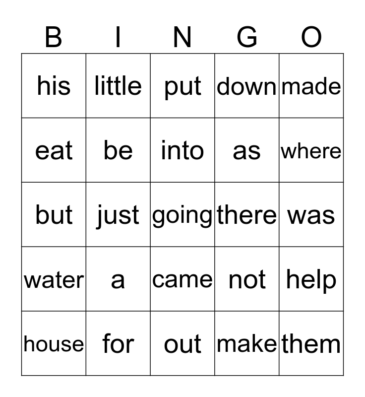 This bingo card has a free space and 24 words: a, for, into, house, made, his, eat, little, there, came, as, but, not, help, be, make, was, put, where, just, them, water, down and out.