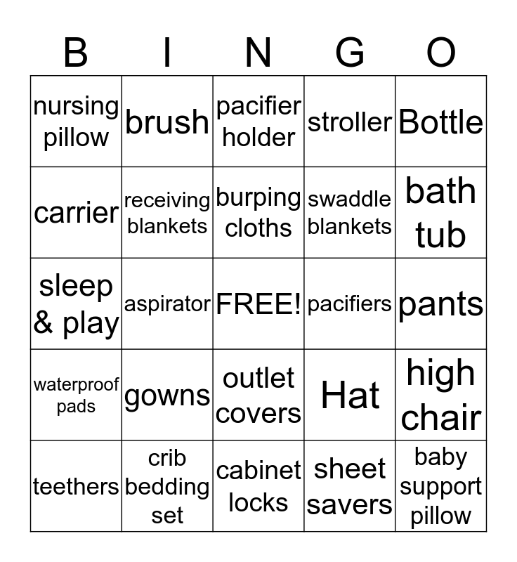 This bingo card has a free space and 61 words: hangers, crib bedding set, fitted crib sheets, waterproof pads, sheet savers, changing table pad, receiving blankets, crib blankets, swaddle blankets, infant car seat, stroller, lightweight stroller, carrier, diaper bag, nursing covers, nursing pillow, baby support pillow, Bottle, bib, burping cloths, pacifiers, pacifier holder, teethers, high chair, diapers, wipes, diaper rash cream, diaper pail, bath tub, bath towels, wash cloths, shampoo, body wash, body lotion, brush, nail clippers, thermometer, aspirator, onesies, sleep & play, side-snap shirts, gowns, pants, socks, Hat, mittens, tutu, Baby Monitor, baby gate, outlet covers, cabinet locks, first aid kit, infant swing, bouncer, Pack n’ play, play mat, itoys, jumper, books, DVDs and music.