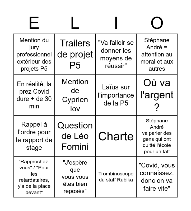 This bingo card has 16 words: "J'espère que vous vous êtes bien reposés", Stéphane André va parler des gens qui ont quitté l'école pour un taff, "Va falloir se donner les moyens de réussir", Mention du jury professionnel extérieur des projets P5, Rappel à l'ordre pour le rapport de stage, Trailers de projet P5, Charte, Trombinoscope du staff Rubika, En réalité, la prez Covid dure + de 30 min, Mention de Cyprien Iov, "Rapprochez-vous" / "Pour les retardataires, y'a de la place devant", Stéphane André = attention au moral et aux autres, Question de Léo Fornini, Où va l'argent ?, Laïus sur l'importance de la P5 and "Covid, vous connaissez, donc on va faire vite".