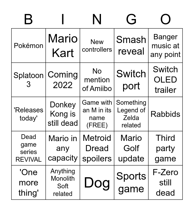 This bingo card has a free space and 24 words: Mario in any capacity, Anything Monolith Soft related, No mention of Amiibo, 'One more thing', Banger music at any point, Pokémon, Splatoon 3, Mario Kart, Something Legend of Zelda related, Metroid Dread spoilers, Switch port, 'Releases today', Mario Golf update, Third party game, Coming 2022, Sports game, Rabbids, New controllers, Switch OLED trailer, Donkey Kong is still dead, F-Zero still dead, Dead game series REVIVAL, Smash reveal and Dog.