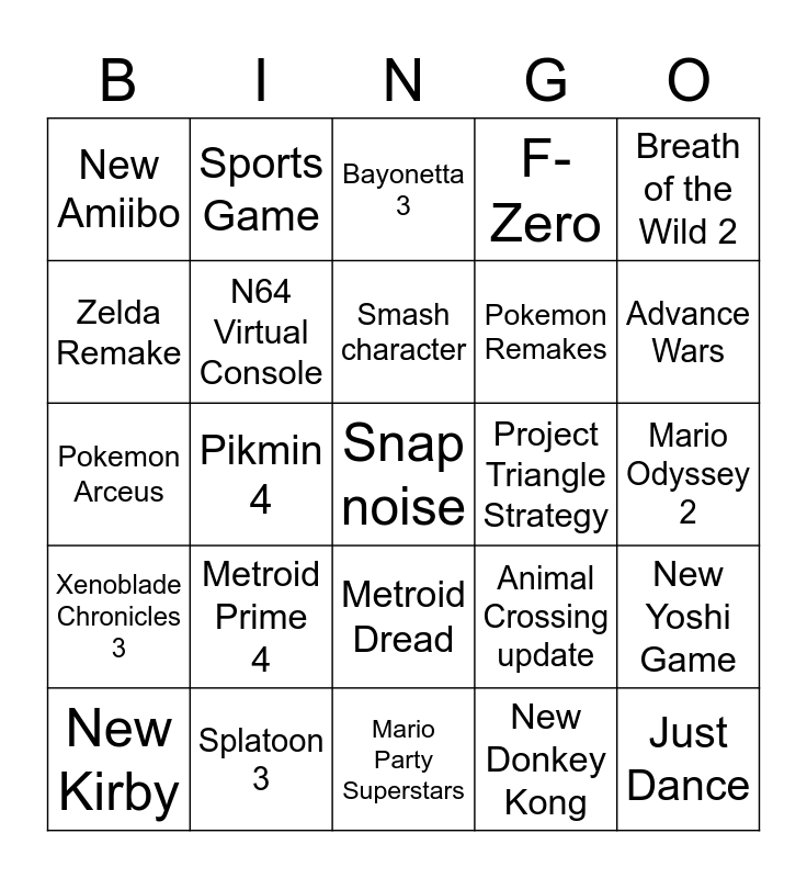 This bingo card has a free space and 24 words: Metroid Prime 4, Splatoon 3, Smash character, New Kirby, Breath of the Wild 2, New Amiibo, Zelda Remake, Sports Game, Project Triangle Strategy, Metroid Dread, Pokemon Remakes, Pokemon Arceus, Animal Crossing update, New Yoshi Game, N64 Virtual Console, New Donkey Kong, Mario Odyssey 2, Bayonetta 3, Advance Wars, Pikmin 4, Just Dance, Xenoblade Chronicles 3, F-Zero and Mario Party Superstars.