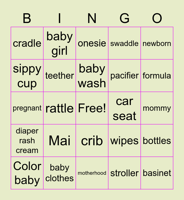 This bingo card has a free space and 24 words: Mai, baby clothes, baby wash, Color baby, newborn, cradle, sippy cup, baby girl, car seat, crib, pacifier, pregnant, wipes, bottles, teether, stroller, mommy, onesie, formula, rattle, basinet, diaper rash cream, swaddle and motherhood.