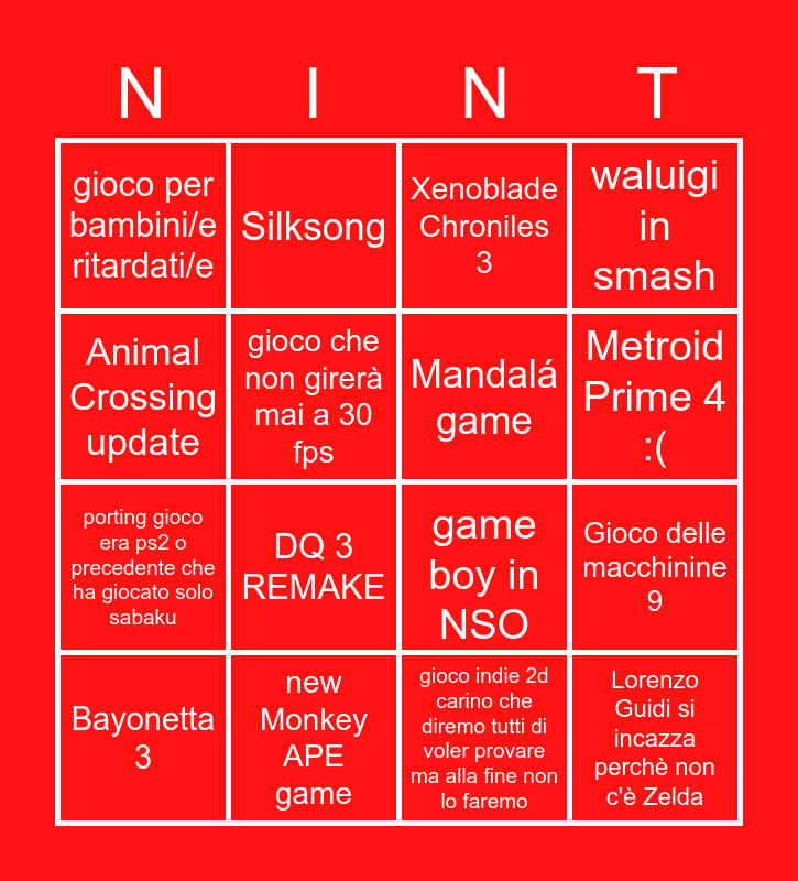 This bingo card has 16 words: Bayonetta 3, new Monkey APE game, Xenoblade Chroniles 3, waluigi in smash, Animal Crossing update, Silksong, game boy in NSO, Gioco delle macchinine 9, gioco per bambini/e ritardati/e, gioco che non girerà mai a 30 fps, gioco indie 2d carino che diremo tutti di voler provare ma alla fine non lo faremo, Metroid Prime 4 :(, porting gioco era ps2 o precedente che ha giocato solo sabaku, DQ 3 REMAKE, Mandalá game and Lorenzo Guidi si incazza perchè non c'è Zelda.
