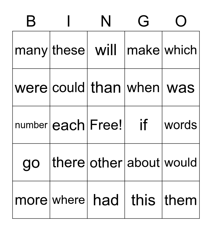 This bingo card has a free space and 24 words: there, where, than, more, which, many, were, these, if, other, when, number, about, would, could, this, words, will, was, each, them, go, make and had.