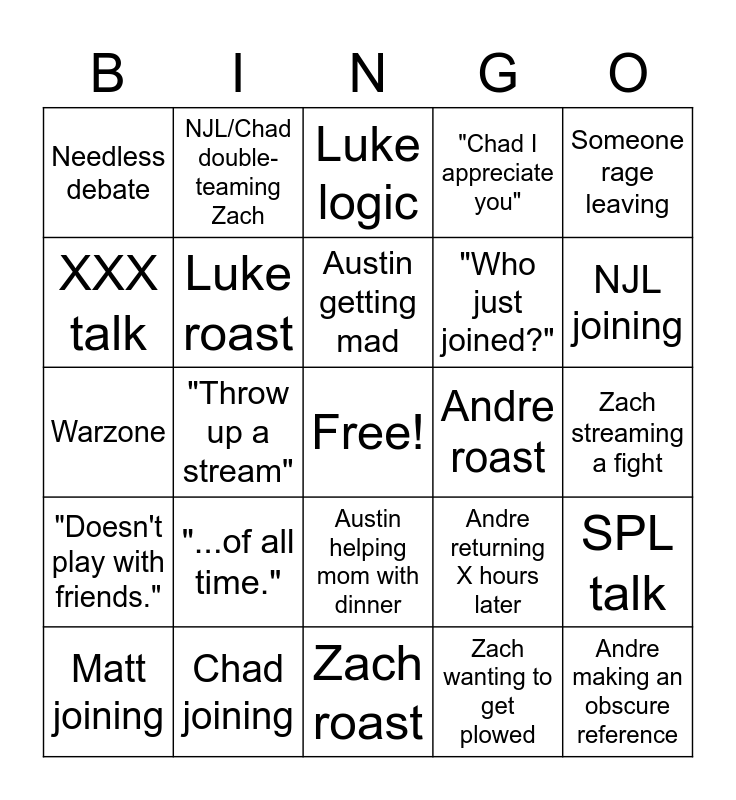 This bingo card has a free space and 24 words: "...of all time.", Chad joining, Austin getting mad, Matt joining, Someone rage leaving, Needless debate, XXX talk, NJL/Chad double-teaming Zach, Andre roast, Austin helping mom with dinner, "Who just joined?", Warzone, Andre returning X hours later, SPL talk, Luke roast, Zach wanting to get plowed, Zach streaming a fight, Luke logic, NJL joining, "Throw up a stream", Andre making an obscure reference, "Doesn't play with friends.", "Chad I appreciate you" and Zach roast.