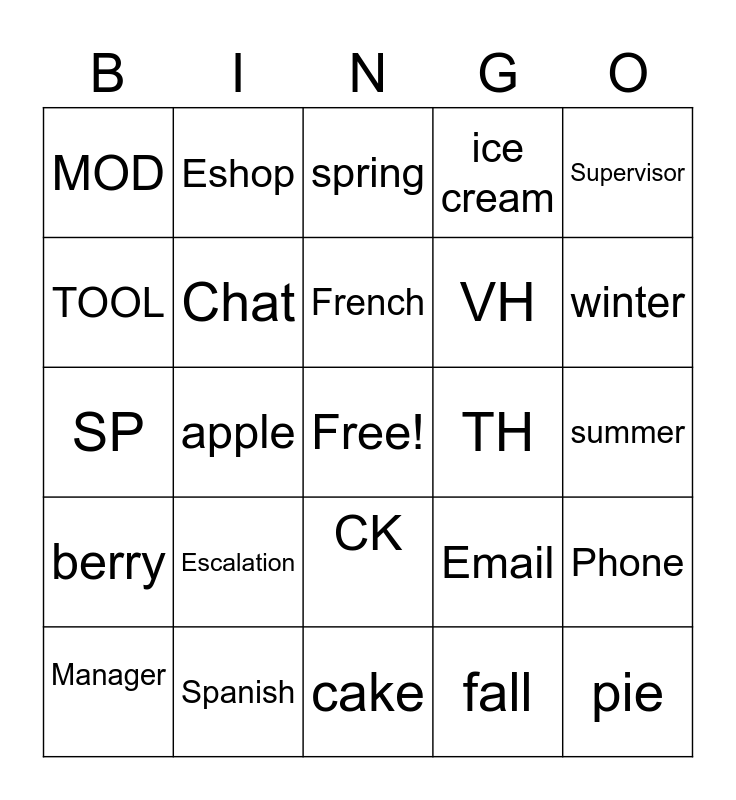 This bingo card has a free space and 24 words: Escalation, Spanish, French, Manager, Supervisor, MOD, TOOL, Eshop, TH, CK, VH, SP, Email, Phone, Chat, fall, summer, spring, winter, apple, pie, berry, ice cream and cake.