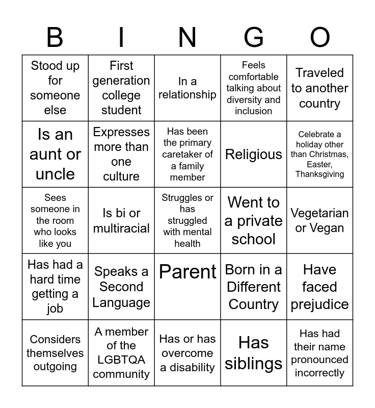 This bingo card has a free space and 24 words: Speaks a Second Language, A member of the LGBTQA community, Has been the primary caretaker of a family member, Considers themselves outgoing, Traveled to another country, Stood up for someone else, Is an aunt or uncle, First generation college student, Went to a private school, Parent, Religious, Sees someone in the room who looks like you, Born in a Different Country, Have faced prejudice, Expresses more than one culture, Has siblings, Vegetarian or Vegan, In a relationship, Celebrate a holiday other than Christmas, Easter, Thanksgiving, Is bi or multiracial, Has had their name pronounced incorrectly, Has had a hard time getting a job, Feels comfortable talking about diversity and inclusion and Has or has overcome a disability.