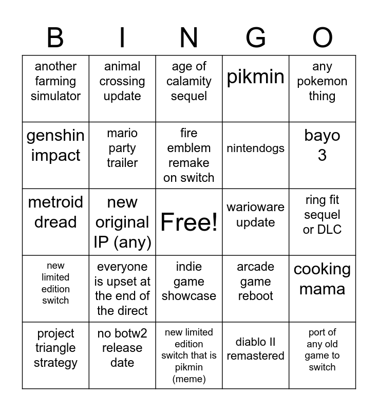 This bingo card has a free space and 24 words: everyone is upset at the end of the direct, no botw2 release date, fire emblem remake on switch, project triangle strategy, any pokemon thing, another farming simulator, genshin impact, animal crossing update, warioware update, indie game showcase, nintendogs, metroid dread, arcade game reboot, cooking mama, mario party trailer, diablo II remastered, ring fit sequel or DLC, age of calamity sequel, bayo 3, new original IP (any), port of any old game to switch, new limited edition switch, pikmin and new limited edition switch that is pikmin (meme).