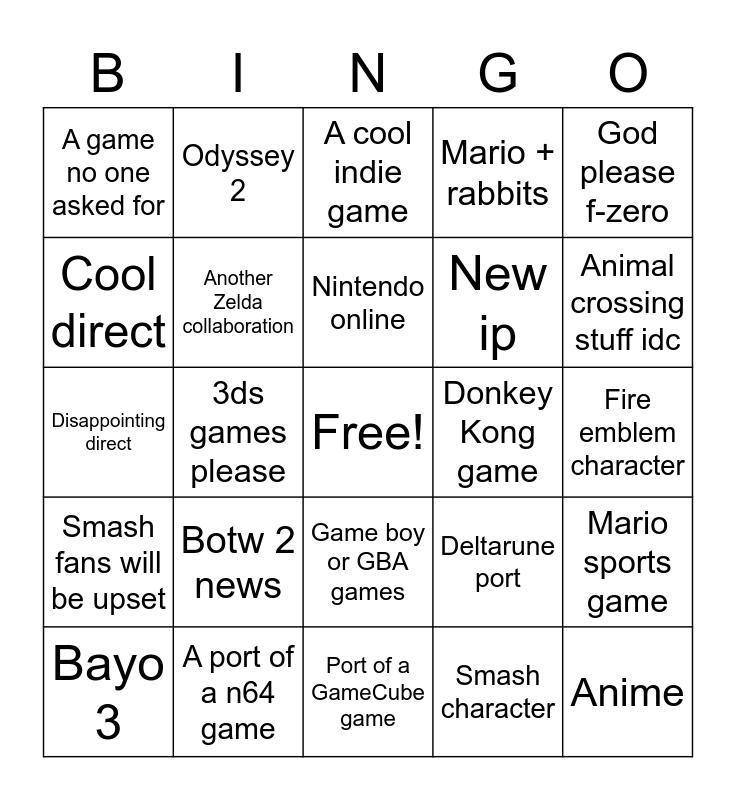 This bingo card has a free space and 24 words: Bayo 3, Botw 2 news, Nintendo online, Smash character, God please f-zero, A game no one asked for, Odyssey 2, A cool indie game, Donkey Kong game, Fire emblem character, Disappointing direct, Another Zelda collaboration, Deltarune port, Mario sports game, Cool direct, A port of a n64 game, Port of a GameCube game, Mario + rabbits, Animal crossing stuff idc, Smash fans will be upset, 3ds games please, Game boy or GBA games, New ip and Anime.