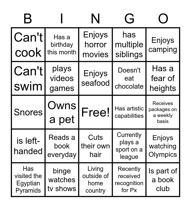 This bingo card has a free space and 24 words: Reads a book everyday, binge watches tv shows, Enjoys seafood, Has visited the Egyptian Pyramids, Enjoys camping, Can't cook, Can't swim, Has a birthday this month, Has artistic capabilities, Cuts their own hair, Doesn't eat chocolate, Snores, Currently plays a sport on a league, Enjoys watching Olympics, plays videos games, Recently received recognition for Px, Receives packages on a weekly basis, Enjoys horror movies, Has a fear of heights, Owns a pet, Is part of a book club, is left-handed, has multiple siblings and Living outside of home country.