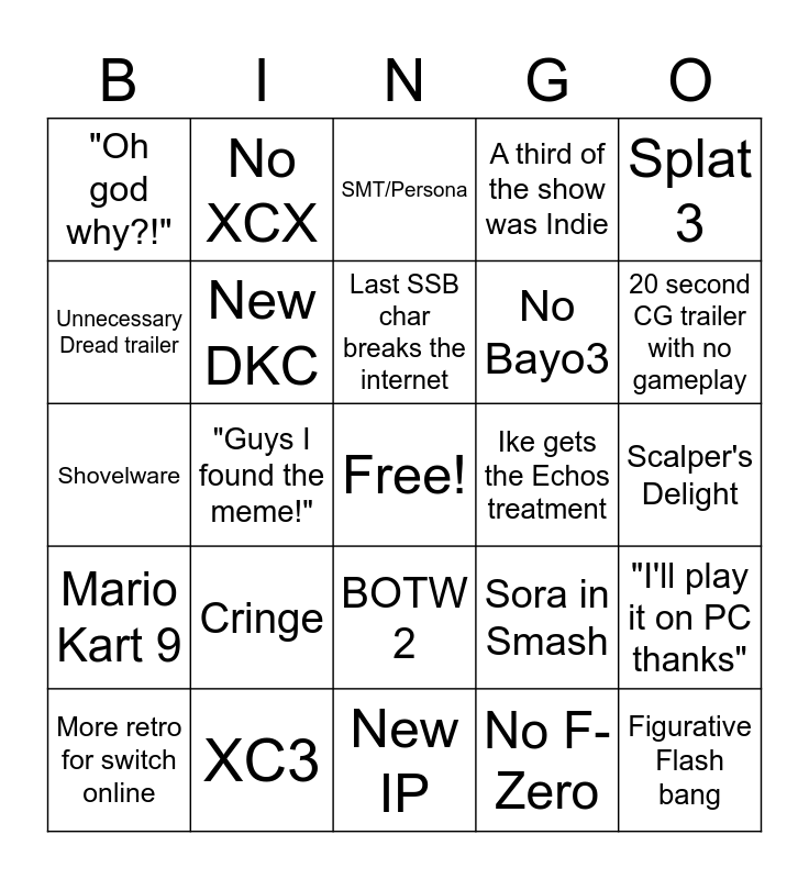 This bingo card has a free space and 24 words: Cringe, XC3, Last SSB char breaks the internet, More retro for switch online, Splat 3, "Oh god why?!", Unnecessary Dread trailer, No XCX, Ike gets the Echos treatment, BOTW 2, No Bayo3, Shovelware, Sora in Smash, "I'll play it on PC thanks", New DKC, No F-Zero, Scalper's Delight, SMT/Persona, 20 second CG trailer with no gameplay, "Guys I found the meme!", Figurative Flash bang, Mario Kart 9, A third of the show was Indie and New IP.