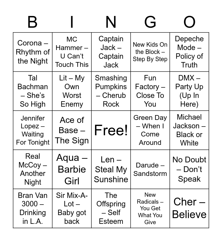 This bingo card has a free space and 75 words: Ace of Base – Don’t Turn Around, Backstreet Boys – Everybody, Captain Jack – Captain Jack, Crazy Town – Butterfly, Depeche Mode – Enjoy the Silence, Fly – Sugar Ray, Haddaway – What Is Love, letters to cleo – I See, Marky Mark And The Funky Bunch – Good Vibrations, Natalie Imbruglia – Torn, Oasis – Wonderwall, Red Hot Chili Peppers – Around the World, Smashing Pumpkins – Cherub Rock, Tal Bachman – She’s So High, Third Eye Blind – Semi-Charmed Life, Ace of Base – The Sign, Bloodhound Gang – The Bad Touch, Cher – Believe, Daft Punk – Around The World, Depeche Mode – Policy of Truth, Foo Fighters – Everlong, Jennifer Lopez – Waiting For Tonight, Lit – My Own Worst Enemy, MC Hammer – U Can’t Touch This, New Kids On the Block – Step By Step, Our Lady Peace – Clumsy, Red Hot Chili Peppers – Californication, Snap! – Rhythm Is a Dancer, The Chemical Brothers – Let Forever Be, TLC – No Scrubs, Alanis Morissette – You Oughta Know, Blur – Song 2, Cornershop – Brimful of Asha, Darude – Sandstorm, DMX – Party Up (Up In Here), Fun Factory – Close To You, Kris Kross – Jump, Los del Rio – Macarena, Michael Jackson – Black or White, New Radicals – You Get What You Give, R.E.M. – Losing My Religion, Robbie Williams – Millennium, Soundgarden – Black Hole Sun, The Cranberries – Dreams, Toni Braxton – He Wasn’t Man Enough, Alice Deejay – Better Off Alone, Bran Van 3000 – Drinking in L.A., Corona – Rhythm of the Night, David Bowie – Im Afraid Of Americans, Duran Duran – Come Undone, Garbage – I Think Im Paranoid, Len – Steal My Sunshine, Madison Avenue – Don’t Call Me Baby, Mr. President – Coco Jambo, Nirvana – Smells Like Teen Spirit, Rammstein – Du hast, Shania Twain – Man! I Feel Like A Woman, Spice Girls – Wannabe, The Offspring – Come Out and Play, Weezer – Buddy Holly, Aqua – Barbie Girl, C+C Music Factory – Gonna Make You Sweat, Counting Crows – Mr. Jones, Deee-Lite – Groove Is In The Heart, Filter – Take a Picture, Green Day – When I Come Around, Lenny Kravitz – Fly Away, Madonna – Vogue, N-Trance – Stayin Alive (feat. Ricardo Da Force), No Doubt – Don’t Speak, Real McCoy – Another Night, Sir Mix-A-Lot – Baby got back, Sublime – What I Got, The Offspring – Self Esteem and Whitney Houston – I’m Every Woman.