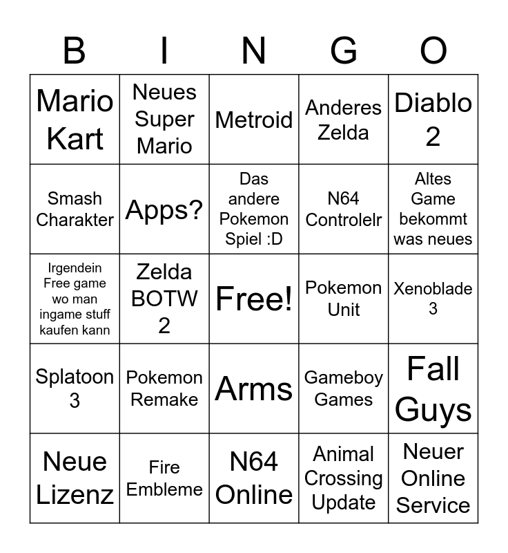 This bingo card has a free space and 24 words: Pokemon Remake, Fire Embleme, Das andere Pokemon Spiel :D, Neue Lizenz, Diablo 2, Mario Kart, Smash Charakter, Neues Super Mario, Pokemon Unit, Arms, N64 Controlelr, Irgendein Free game wo man ingame stuff kaufen kann, Gameboy Games, Fall Guys, Apps?, Animal Crossing Update, Xenoblade 3, Metroid, Altes Game bekommt was neues, Zelda BOTW 2, Neuer Online Service, Splatoon 3, Anderes Zelda and N64 Online.