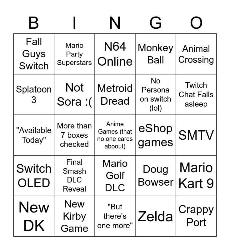 This bingo card has a free space and 24 words: Final Smash DLC Reveal, New Kirby Game, Metroid Dread, New DK, Animal Crossing, Fall Guys Switch, Splatoon 3, Mario Party Superstars, eShop games, Mario Golf DLC, No Persona on switch (lol), "Available Today", Doug Bowser, Mario Kart 9, Not Sora :(, Zelda, SMTV, N64 Online, Twitch Chat Falls asleep, More than 7 boxes checked, Crappy Port, Switch OLED, Monkey Ball and "But there's one more".