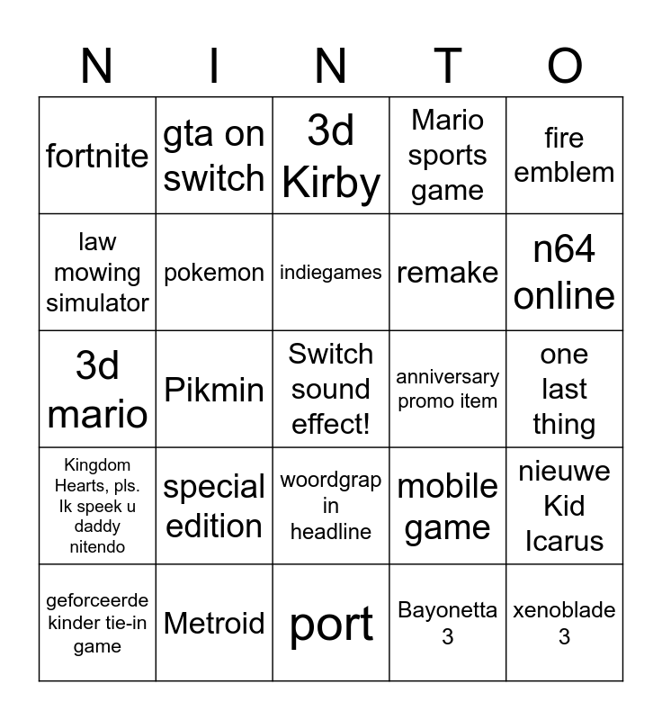 This bingo card has a free space and 41 words: smash fighter, 3d mario, zelda, pokemon, Metroid, woordgrap in headline, indiegames, weebgame, fire emblem, Kingdom Hearts, pls. Ik speek u daddy nitendo, Pikmin, Mario sports game, xenoblade 3, one last thing, anniversary promo item, special edition, pre order bonus, fortnite, Boze chat, 3d Kirby, nieuwe Kid Icarus, switch online, port, remake, amiibo, 2d mario, Bayonetta 3, splatoon 3, n64 online, donkey kong, Doshin the giant, gta on switch, geforceerde kinder tie-in game, lego game, mobile game, law mowing simulator, Persona, furry game, strategy game, final fantasy and random mario spinoff.