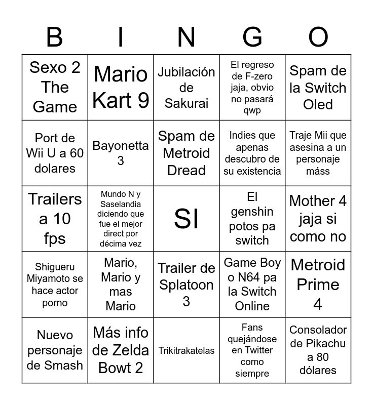 This bingo card has a free space and 24 words: Mario, Mario y mas Mario, Más info de Zelda Bowt 2, Spam de Metroid Dread, Nuevo personaje de Smash, Spam de la Switch Oled, Sexo 2 The Game, Port de Wii U a 60 dolares, Mario Kart 9, El genshin potos pa switch, Trailer de Splatoon 3, Indies que apenas descubro de su existencia, Trailers a 10 fps, Game Boy o N64 pa la Switch Online, Metroid Prime 4, Bayonetta 3, Fans quejándose en Twitter como siempre, Mother 4 jaja si como no, Jubilación de Sakurai, Traje Mii que asesina a un personaje máss, Mundo N y Saselandia diciendo que fue el mejor direct por décima vez, Consolador de Pikachu a 80 dólares, Shigueru Miyamoto se hace actor porno, El regreso de F-zero jaja, obvio no pasará qwp and Trikitrakatelas.
