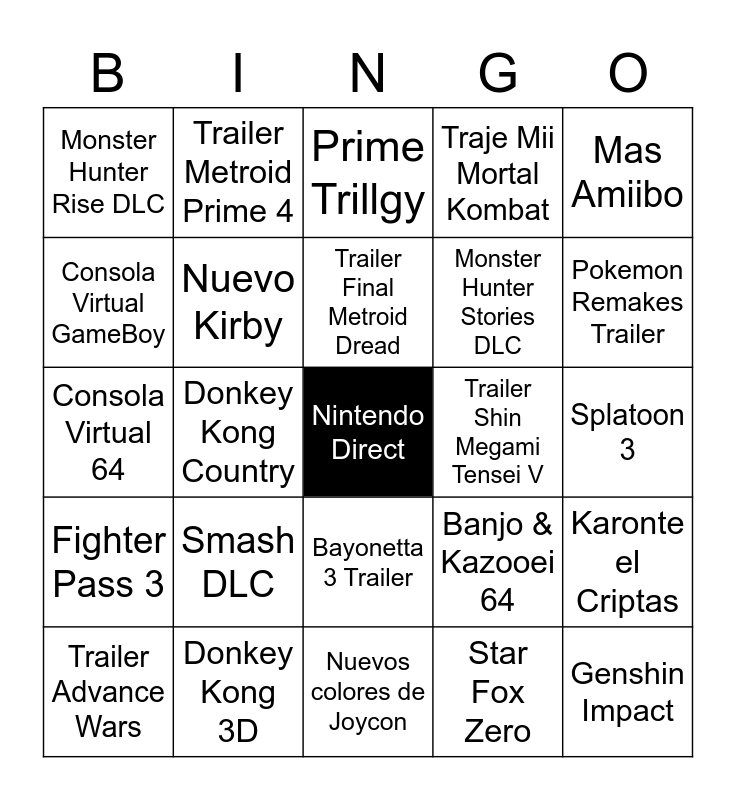 This bingo card has a free space and 24 words: Smash DLC, Donkey Kong 3D, Trailer Final Metroid Dread, Trailer Advance Wars, Mas Amiibo, Monster Hunter Rise DLC, Consola Virtual GameBoy, Trailer Metroid Prime 4, Trailer Shin Megami Tensei V, Bayonetta 3 Trailer, Monster Hunter Stories DLC, Consola Virtual 64, Banjo & Kazooei 64, Karonte el Criptas, Nuevo Kirby, Star Fox Zero, Splatoon 3, Prime Trillgy, Pokemon Remakes Trailer, Donkey Kong Country, Genshin Impact, Fighter Pass 3, Traje Mii Mortal Kombat and Nuevos colores de Joycon.