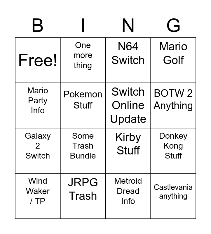 This bingo card has 16 words: Wind Waker / TP, JRPG Trash, N64 Switch, Mario Golf, Mario Party Info, One more thing, Kirby Stuff, Donkey Kong Stuff, Free!, Pokemon Stuff, Metroid Dread Info, BOTW 2 Anything, Galaxy 2 Switch, Some Trash Bundle, Switch Online Update and Castlevania anything.