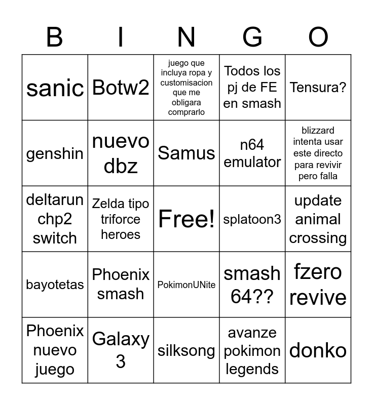 This bingo card has a free space and 24 words: Phoenix smash, Galaxy 3, Samus, Phoenix nuevo juego, Tensura?, sanic, genshin, Botw2, splatoon3, PokimonUNite, n64 emulator, deltarun chp2 switch, smash 64??, fzero revive, nuevo dbz, avanze pokimon legends, update animal crossing, juego que incluya ropa y customisacion que me obligara comprarlo, blizzard intenta usar este directo para revivir pero falla, Zelda tipo triforce heroes, donko, bayotetas, Todos los pj de FE en smash and silksong.