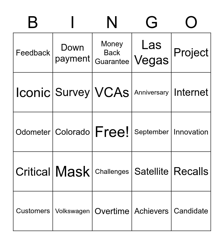 This bingo card has a free space and 39 words: Virtual, Instant Offer, Technology, Survey, Customers, Challenges, VCAs, Opportunity, Project, Critical, Colorado, Las Vegas, Candidate, Innovation, September, Mask, Happy, Feedback, Hurricane, Satellite, Iconic, Overtime, Anniversary, Internet, Florida, Holidays, Jeep, Birthday, Home Delivery, Down payment, Georgia, President’s Club, Money Back Guarantee, Volkswagen, Achievers, April, Recalls, Odometer and Hyundai.