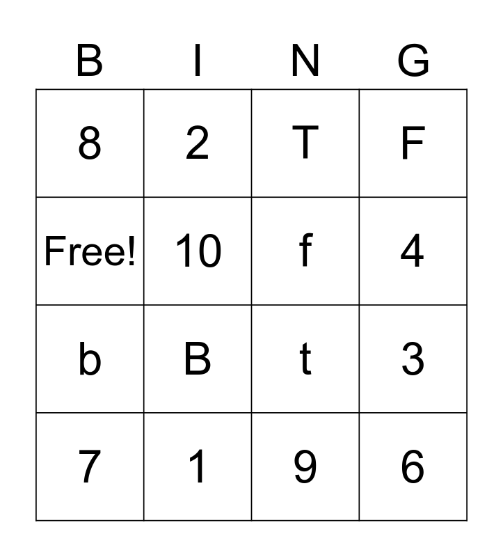 This bingo card has 16 words: 1, 3, T, 8, b, 2, t, 9, Free!, 10, 7, F, B, 4, f and 6.