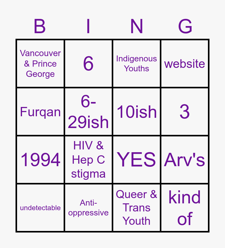 This bingo card has 25 words: Free!, Community Outreach, 3, Positive Programs Coordinator, Furqan, Vancouver & Prince George, 6-29ish, 6, Anti-oppressive, Harm Reduction, 1994, YES, Janna, LPY, 10ish, Camp Moomba, Queer & Trans Youth, Indigenous Youths, HIV & Hep C stigma, Arv's, undetectable, Curable, kind of, website and Samira.