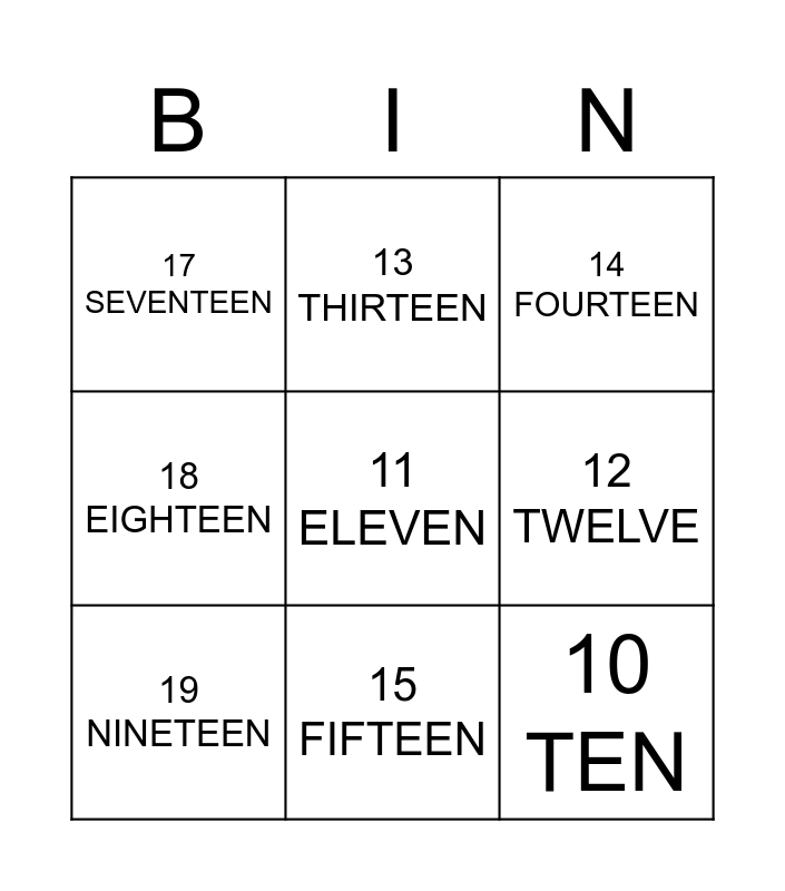 This bingo card has 12 words: Free!, 10 TEN, 11 ELEVEN, 12 TWELVE, 13 THIRTEEN, 14 FOURTEEN, 15 FIFTEEN, 16 SIXTEEN, 17 SEVENTEEN, 18 EIGHTEEN, 19 NINETEEN and 20 TWENTY.