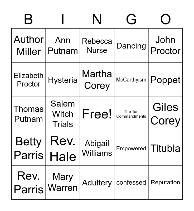 This bingo card has a free space and 24 words: Rev. Hale, Mary Warren, Martha Corey, Rev. Parris, John Proctor, Author Miller, Elizabeth Proctor, Ann Putnam, The Ten Commandments, Abigail Williams, McCarthyism, Thomas Putnam, Empowered, Titubia, Hysteria, confessed, Giles Corey, Rebecca Nurse, Poppet, Salem Witch Trials, Reputation, Betty Parris, Dancing and Adultery.