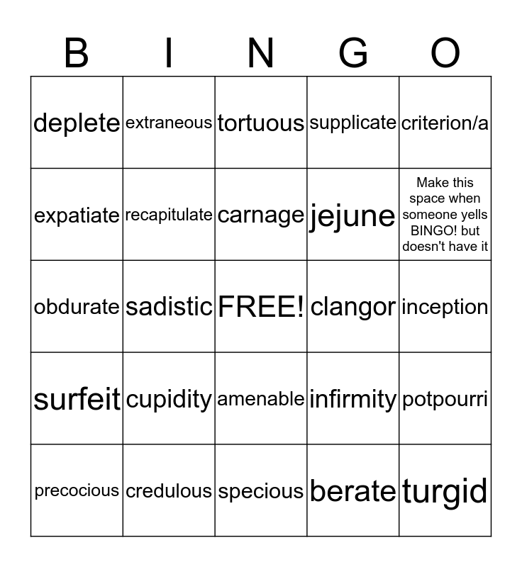 This bingo card has a free space and 26 words: amenable, berate, carnage, credulous, criterion/a, deplete, expatiate, extraneous, inception, infirmity, jejune, obdurate, potpourri, precocious, sadistic, sententious, supplicate, surfeit, tortuous, turgid, Make this space when someone yells BINGO! but doesn't have it, specious, clangor, cupidity, recapitulate and slovenly.