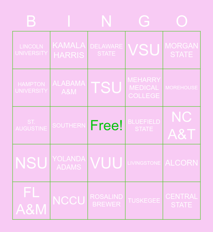 This bingo card has a free space and 24 words: YOLANDA ADAMS, NCCU, TSU, FL A&M, MORGAN STATE, LINCOLN UNIVERSITY, HAMPTON UNIVERSITY, KAMALA HARRIS, BLUEFIELD STATE, VUU, MEHARRY MEDICAL COLLEGE, ST. AUGUSTINE, LIVINGSTONE, ALCORN, ALABAMA A&M, TUSKEGEE, NC A&T, DELAWARE STATE, MOREHOUSE, SOUTHERN, CENTRAL STATE, NSU, VSU and ROSALIND BREWER.