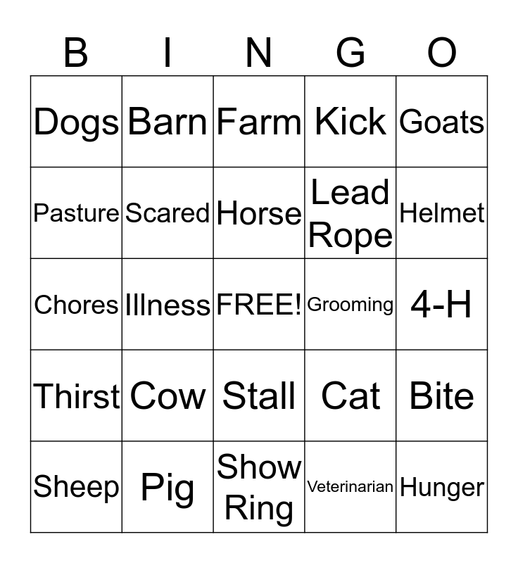 This bingo card has a free space and 24 words: Cow, Pig, Horse, Sheep, Goats, Dogs, Pasture, Barn, Grooming, Stall, Lead Rope, Chores, Cat, Bite, Scared, Veterinarian, 4-H, Farm, Helmet, Illness, Hunger, Thirst, Kick and Show Ring.